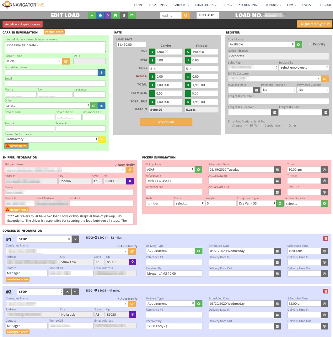 The load sheet is the engine of NavigatorTMS. Loads can be built in a matter of seconds, and then allow all kinds of data to be stored and viewed relative to each individual load. These screens provide an enormous amount of relative shipment and financial data in an instant. Storage capabilities are built into these screens to allow for POD upload and storage, or storage of any other document related to an individual load. Invoicing is easily conducted through these screens. Vast amounts of data on carriers, shippers, consignees, and billing locations are visible and stored on this screen which gives the user any piece of information they need to properly monitor any individual shipment.